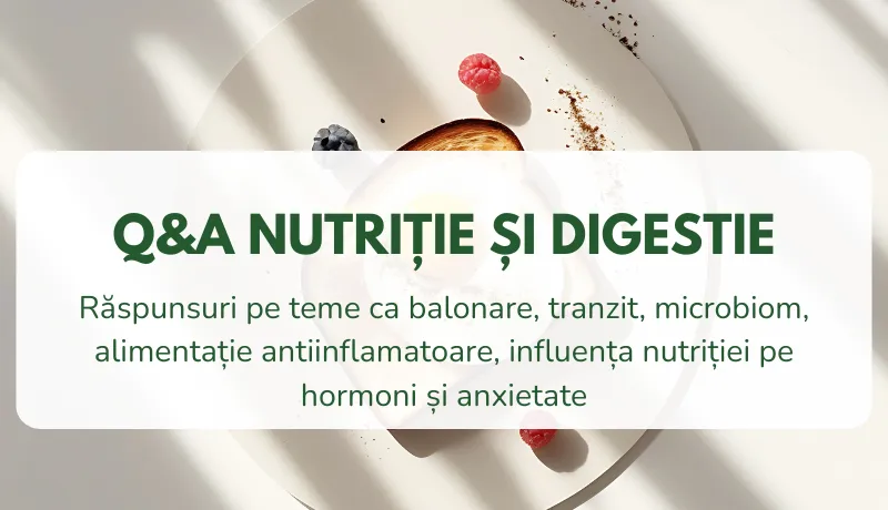 Cu Anamaria Ștefu, dietetician licențiat — răspunsuri directe în platformă pe teme ca balonare, tranzit, microbiom, alimentație antiinflamatoare, influența nutriției pe hormoni și anxietate.